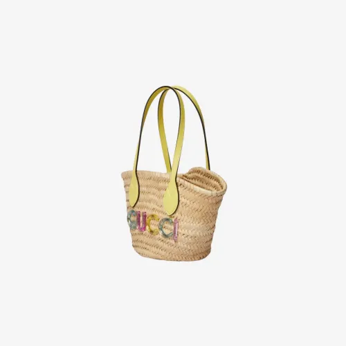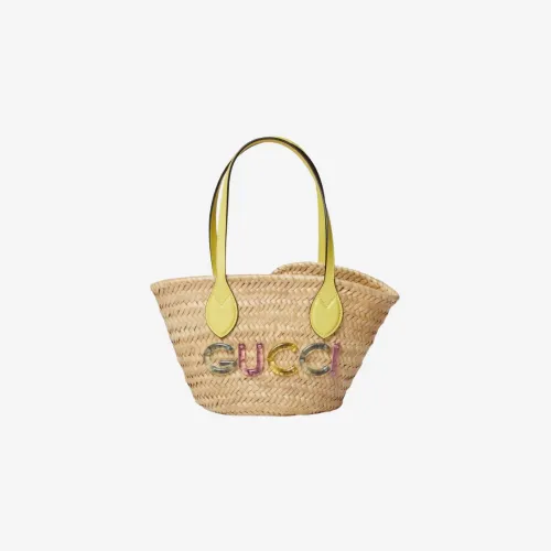 구찌 미니 토트백 로고 우븐 스트로우 내츄럴 옐로우